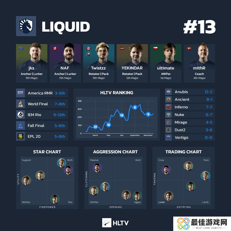 数据:ultimate连续三场赛事表现不佳(rating分别为0.90、0.84 0.79),但在RMR上面对实力较弱的对手时,他的表现有所反弹,rating达到1.30。对于Liquid来说,如何在不对他进行过度指导的情况下让他的超强侵略性风格发挥作用是一个有趣的命题。