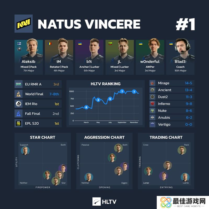 趣事:自7月22日首次登顶以来,Natus Vincere在过去19周中有17周排名第一,是今年排名第一最多的队伍,超越了FaZe(14 周)。他们也是唯一参加了全部21届Major的队伍。
