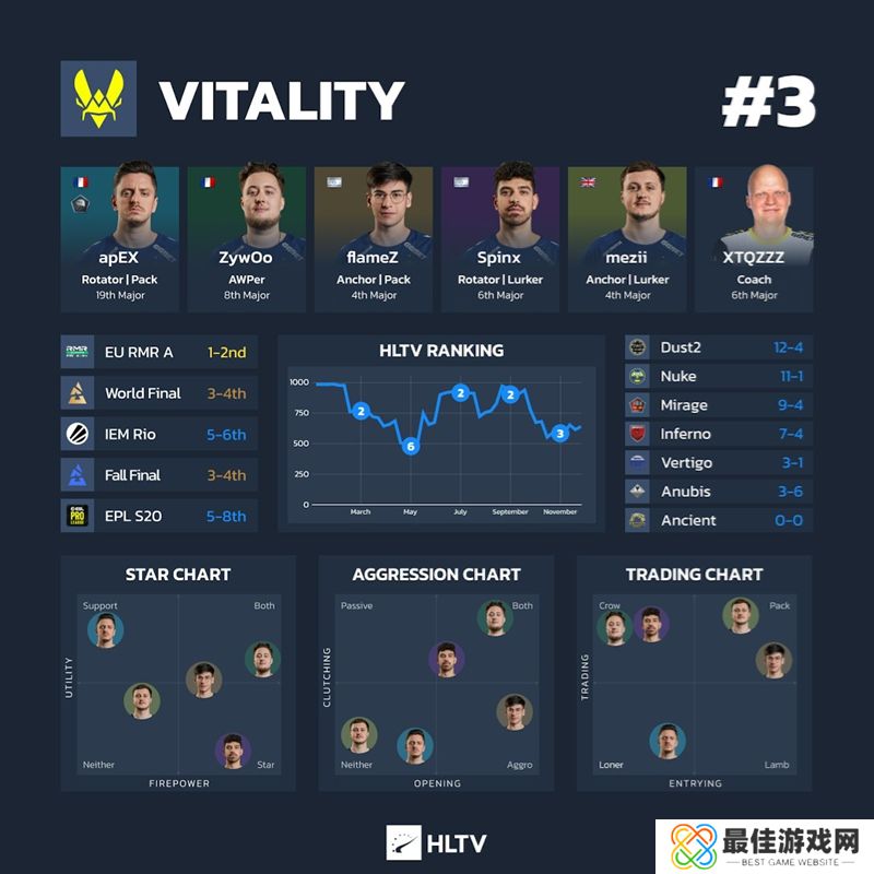 数据:Vitality是法国经典地图Dust2的早期采用者,根据EDGE的数据,他们在本赛季的系列赛中有50%选择了 Dust2,并在16场比赛中赢得了其中12张。