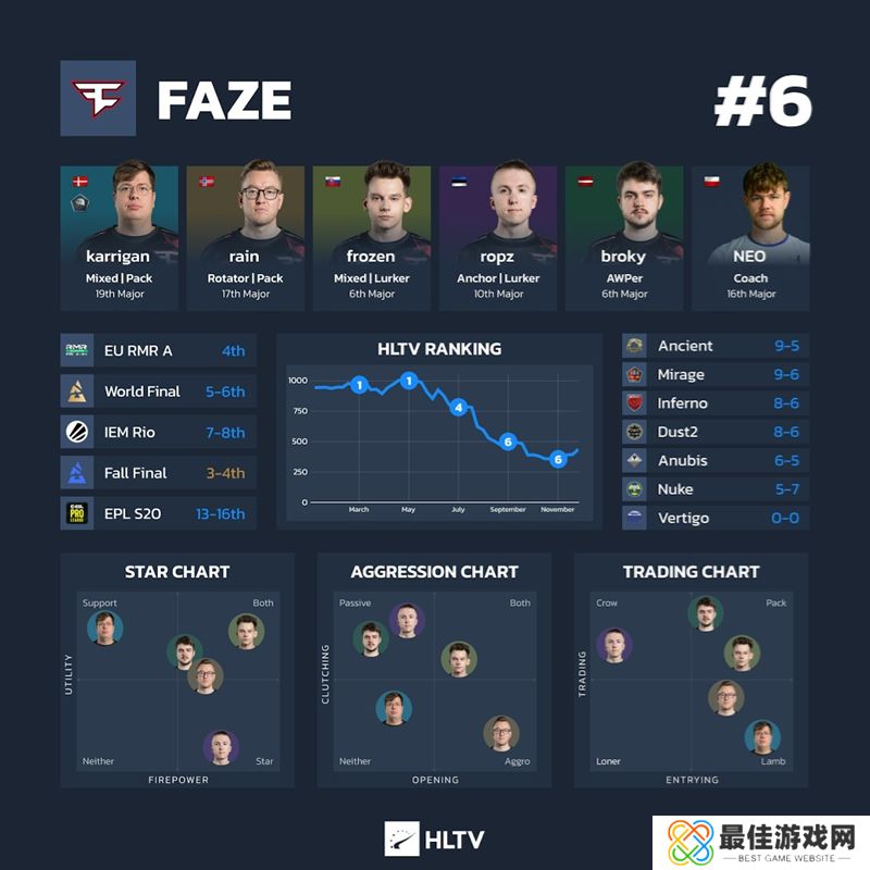 数据:从2022年2月夺得IEM 卡托维兹站冠军到2024年7月之间的119周内FaZe除了8周之外,其余时间都排名前五。不过,自7月22日以来,他们已连续19周没有进入前五名。