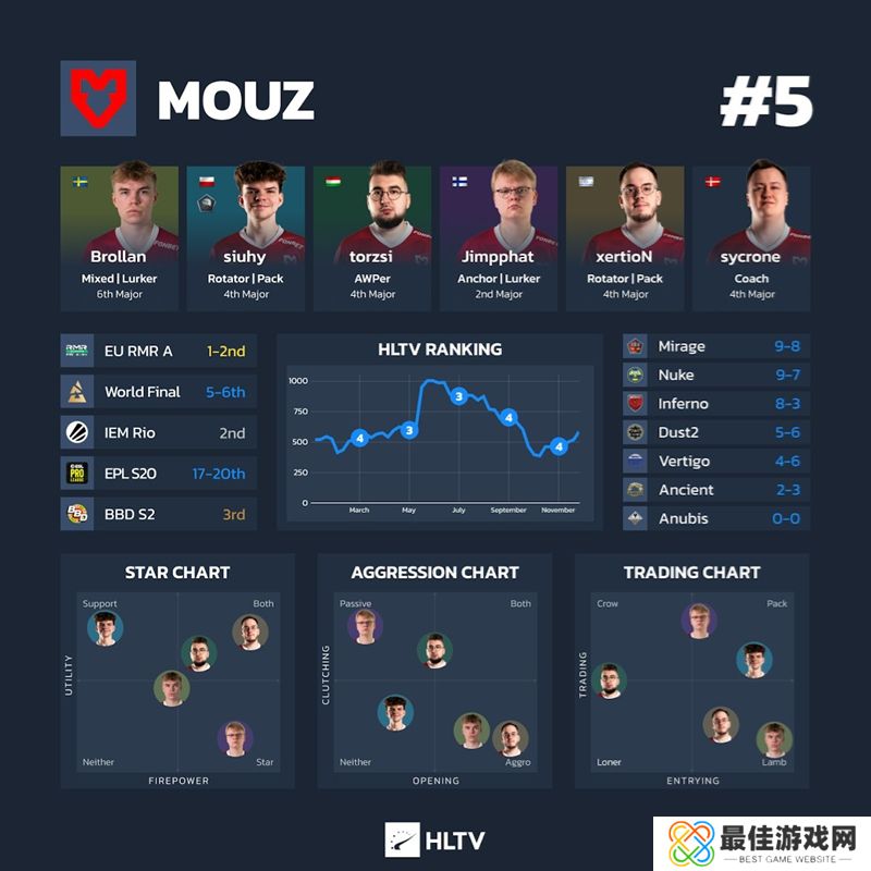 趣事:MOUZ 2024年在小组赛和演播室表现出色,但在大型赛场上与世界上最好的战队交锋时却举步维艰。xertioN是罪魁祸首,他的总rating从1.15下降到竞技场比赛中的0.98。