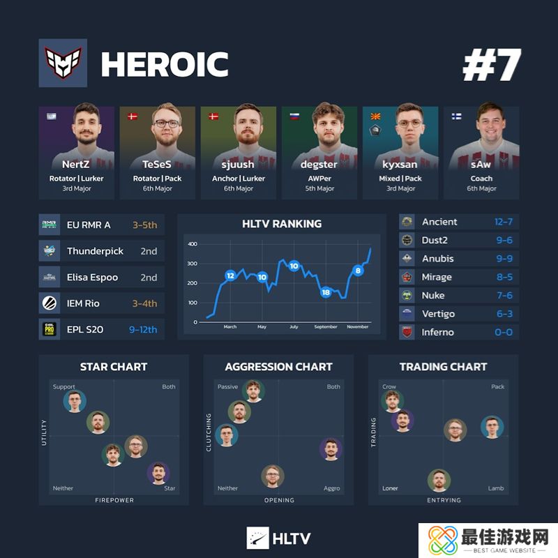 趣事:TeSeS和sjuush在他们与HEROIC一起参加的前四届Major中都进入了淘汰赛,但在哥本哈根却未能打进八强。在闯入世界排名前七名后,他们将上海Major的目标定为前八名。