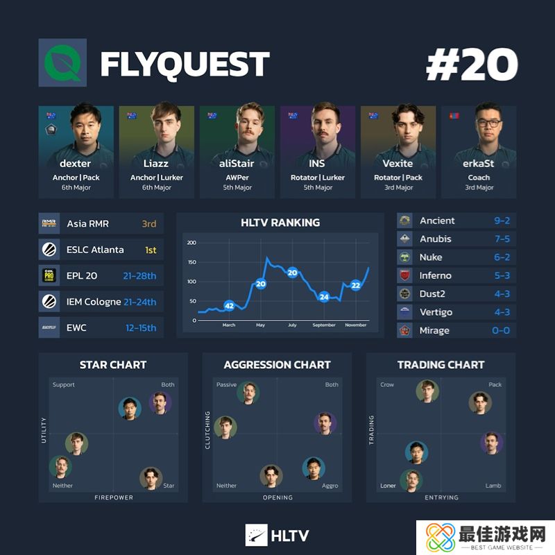数据:FlyQuest在三张地图上取得了连胜: Nuke(5)、Anicent(6)和Anubis(6)。