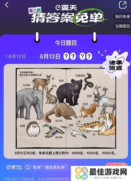 饿了么免单8 13的正确答案提供,今天这期免单答案是以动物保护方面为主的,关于饿了么免单8 13的正确答案信息,想了解的小伙伴下面一起来看看吧。饿了么免单8 13答案一览8月13日的免单一共有着3场,