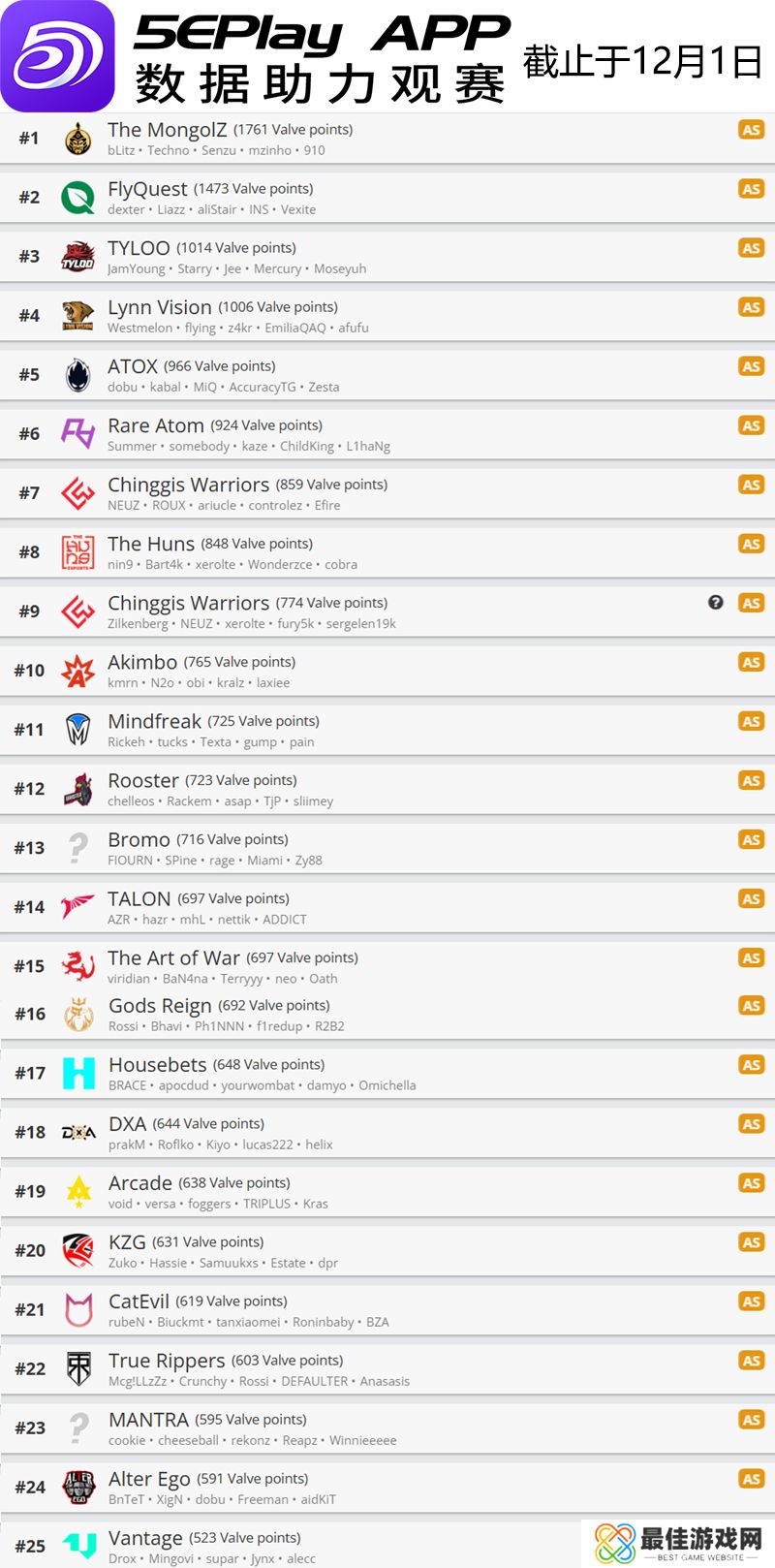 V社世界排名1201:G2第一 The MongolZ第五