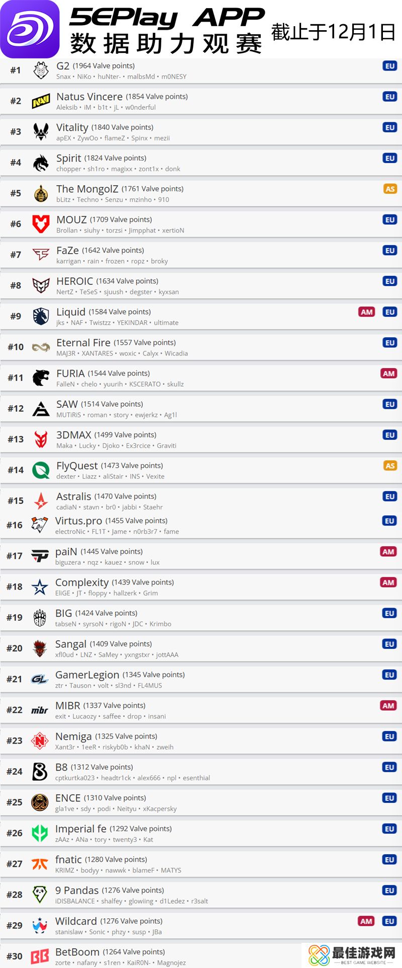 今天V社更新了旗下CS世界排名,这一世界排名会和明年的赛事邀请紧密联系,因此是主办方和战队都必须关注的内容。