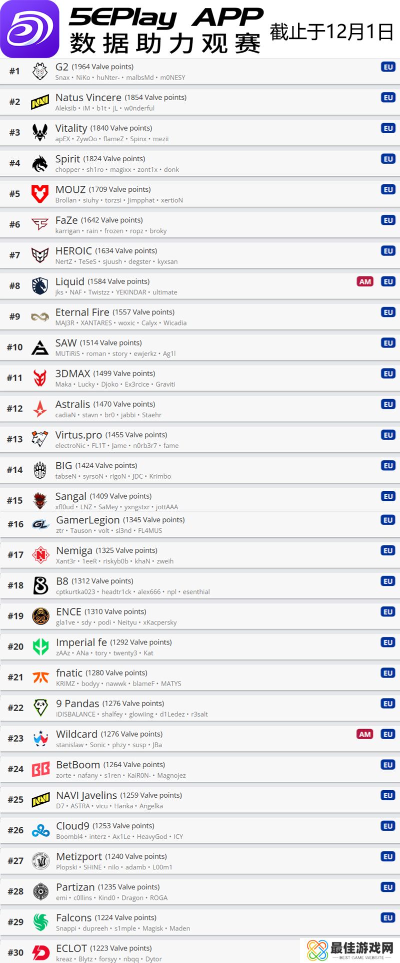欧洲区前30名如下: