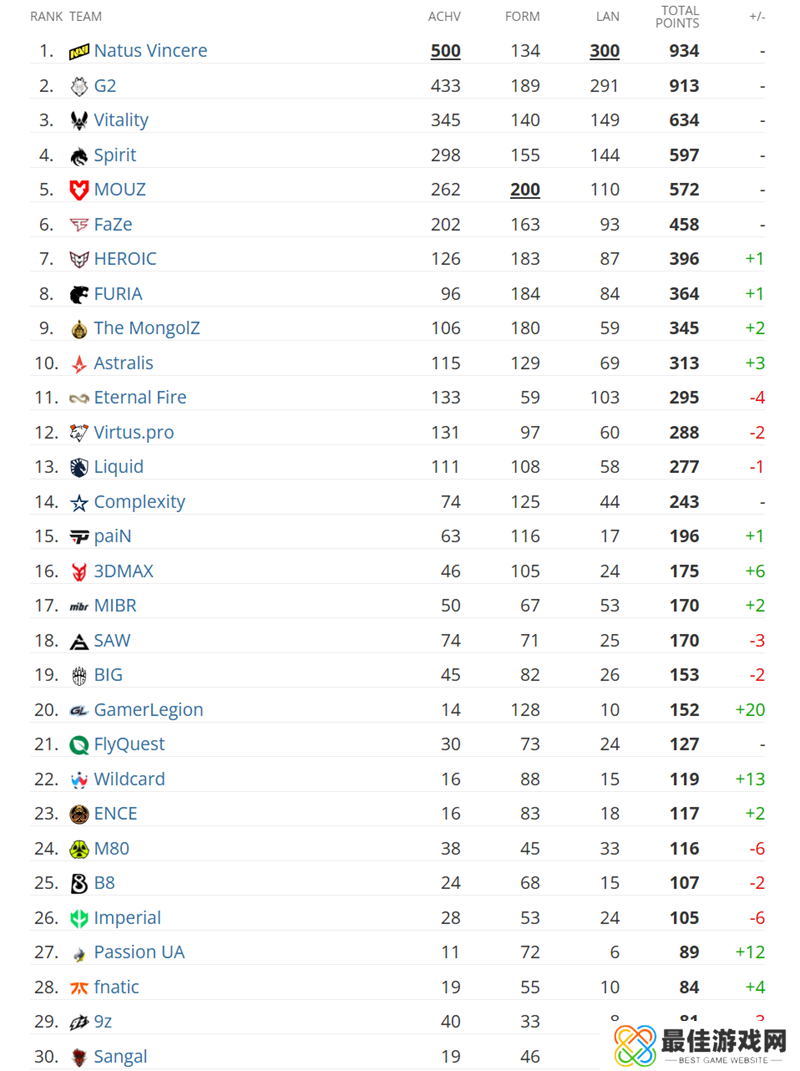 Natus Vincere仅以21分的微弱优势占据榜首;