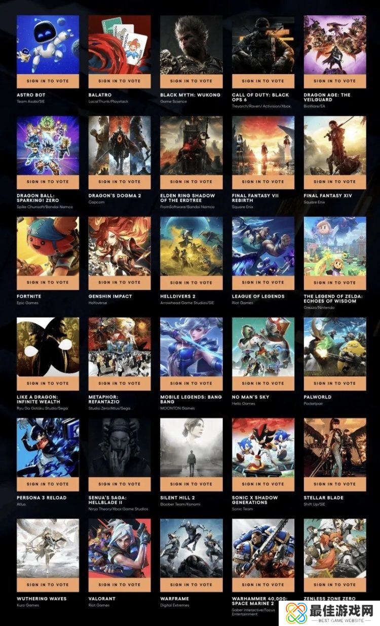 《宇宙机器人》、《小丑牌》、《黑神话:悟空》、《使命召唤21:黑色行动》、《龙腾世纪4:影障守护者》、《七龙珠 电光炸裂!ZERO》、《龙之信条2》、《艾尔登法环:黄金树幽影》、《最终幻想7:重生》、《最终幻想14》、《堡垒之夜》、《原神》、《绝地潜兵2》、《英雄联盟》、《塞尔达传说:智慧的再现》、《如龙8》、《暗喻幻想》、《决胜巅峰(无尽对决)》、《无人深空》、《幻兽帕鲁》、《女神异闻录3》、《地狱之刃2》、《寂静岭2》、《索尼克》、《剑星》、《鸣潮》、《无畏契约》、《星际战甲》、《战锤40K:星际战士2》、《绝区零》