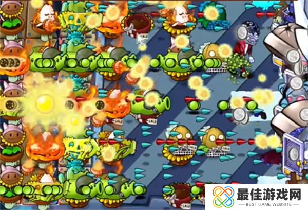 6、然后在左边的四列输出植物上分别放机枪豌豆荚和燃烧南瓜头,提升火力和防御。