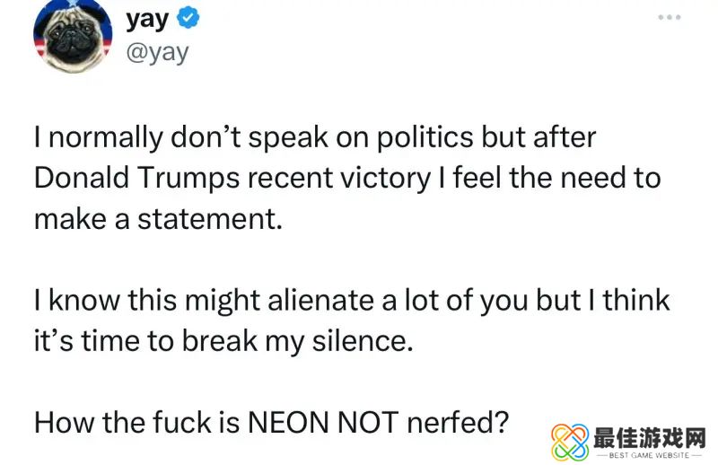 yay发文花式整活,原文大意如下:我通常不会谈论政治,但唐纳德·特朗普最近的胜利让我觉得有必要发表声明。我知道这可能会疏远你们很多人,但我认为是时候打破沉默了,为什么TMD霓虹还没有被削弱?