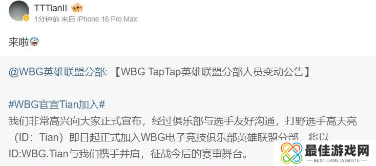 直播吧12月4日讯 WBG官宣了打野选手Tian的加盟,Tian选手转发官宣微博,并配文:来啦~