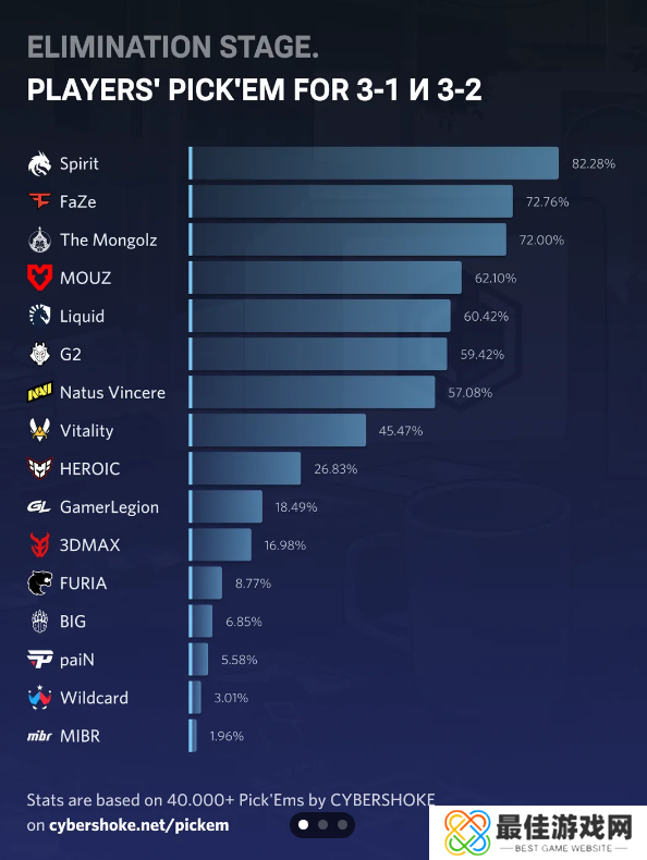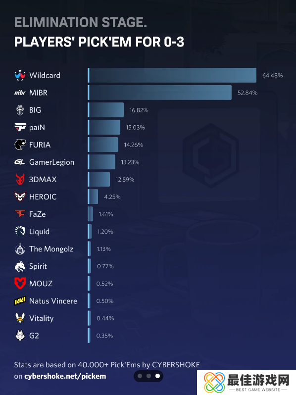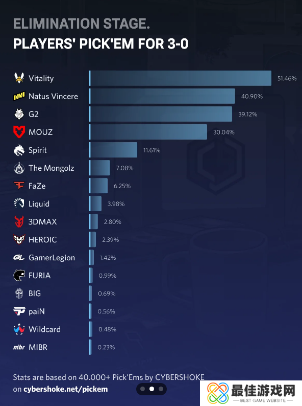 Vitality战队被选择最多,在40000+选手中有51.46%选择将Vitality放到3-0,其后是