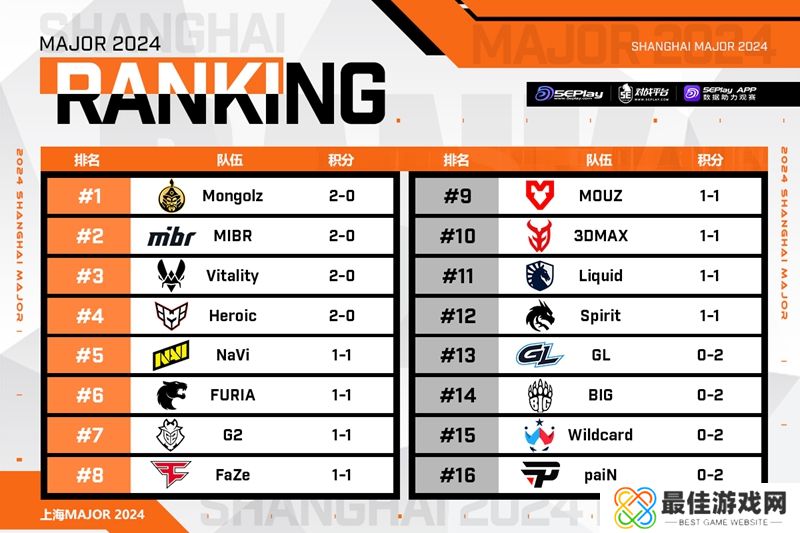 上海Major正赛阶段第一日的比赛已经告一段落,在第一日比赛中,The MongolZ状态极佳,先后战胜G2和MOUZ这两支劲敌,进入到了2-0组,同样为2-0组的还有MIBR、Vitality和HE
