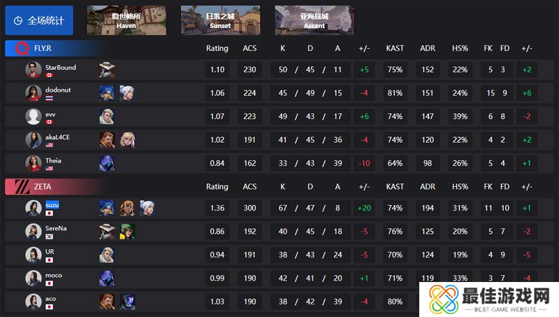 图一隐世修所,ZETA 6:13 FLY,图二日落之城,ZETA 13:10 FLY,图三亚海悬城,ZETA 13:6 FLY。来自ZETA的日本选手suzu拿到了全场最高的67总击杀。