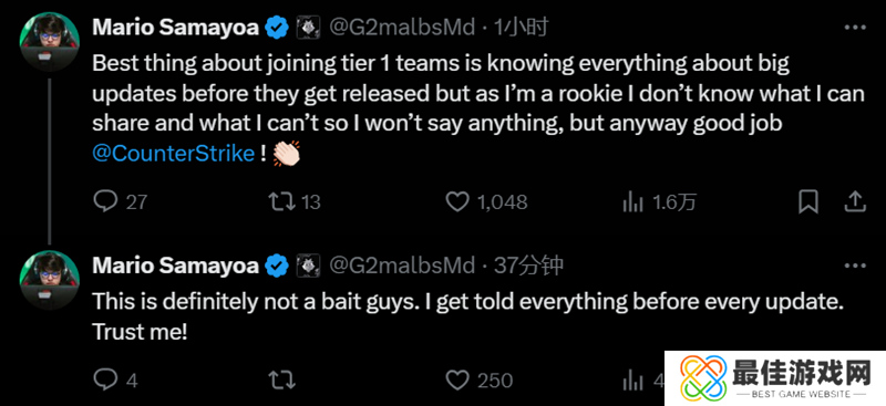 这次更新或许和de_Train回归有关。今天G2战队选手malbsMd在社交平台上发布动态,表示这次更新真的非常赞。“成为一线战队选手最棒的地方在于可以提前知道大更新的内容。但我在这方面还是新人,不确