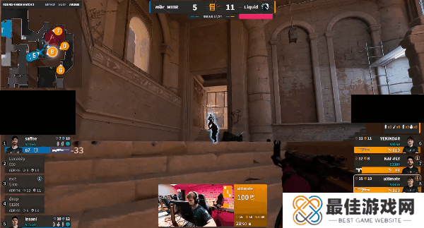 下半场Liquid来到进攻方,手枪局正门烟直接下管道,埋下炸弹后凭借枪位优势轻松拿下胜利。次回合MIBR强起,Liquid直接四人外场展开,拿到双杀后原地架枪,最后逐一击破MIBR,比分顺势来到9-6。
