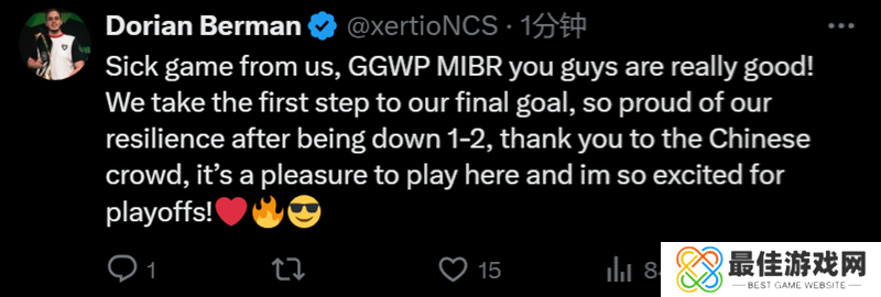 xertioN:我们的发挥很棒。GGWP MIBR,你们也很优秀。我们朝着最终的目标迈出了第一步,在1-2战绩落后的情况下,我们仍旧保持着坚韧的意志,对此我感到非常自豪,感谢中国观众,在这里比赛我很荣幸,我对晋级淘汰赛感到非常兴奋!