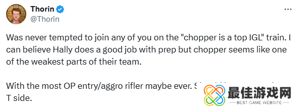 “我从未赞同过你们所说的‘chopper是顶级指挥’的说法,我相信hally的准备工作做得很好,但chopper似乎是他们队伍中最薄弱的一环。