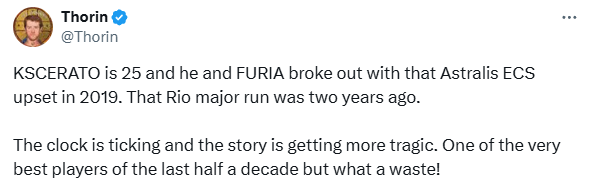 FURIA在昨日比赛中1-2不敌FaZe止步上海Major十六强。赛后,英国知名电竞记者Thorin在个人社交媒体账号上谈到了对巴西选手KSCERATO的看法。“KSCERATO今年已经25岁了,他曾