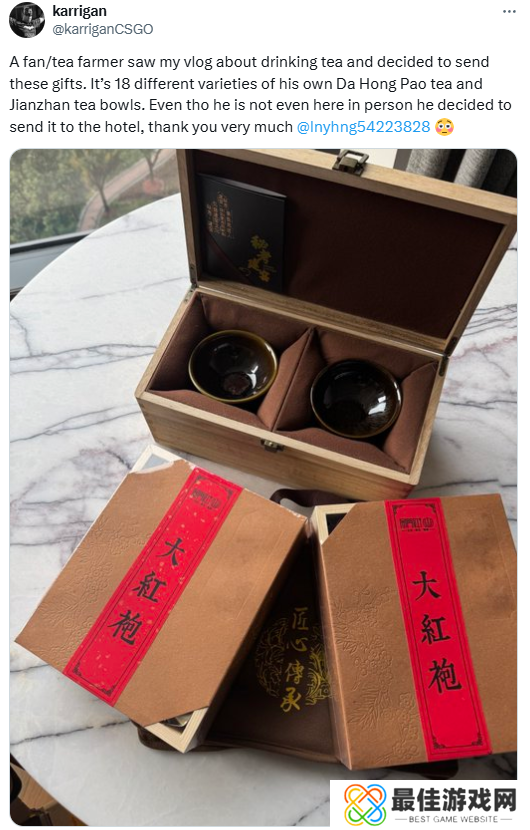 karrigan收到中国粉丝自种大红袍茶叶和建盏茶碗