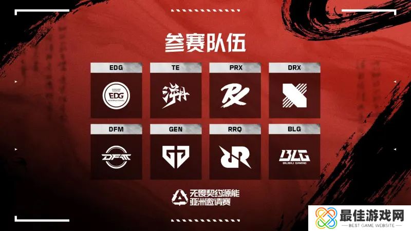 八支参加无畏契约源能亚洲邀请赛的队伍现已集结完毕,此前已有七支队伍确定参赛,最后一个席位日前确定将由CN联赛的BLG战队参加!参赛队伍如下:EDG、TE、PRX、DRX、DFM、GEN、RRQ、BLG