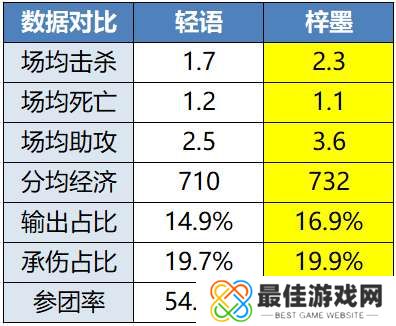 而轻语今晚的对手梓墨,则是本届年总个人数据最豪华的对抗路选手。独占一档的KDA、第一的分均经济和参团率、第二的场均击杀、第三的场均助攻和输出占比。作为身在精英组的选手,擂台赛阶段把把对阵大师组队伍打出这等数据,只能说状态恐怖。上海EDG.M的新人边路小泽前不久还倒反天罡的给TTG的通天边路上课,到淘汰赛对位梓墨立马就被反教学。今晚这两位对抗路选手之间的碰撞,绝对会非常精彩。