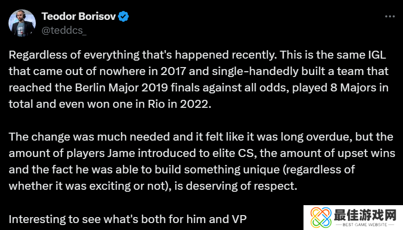 这种变阵是非常必要的,而且感觉早该做出改变,但Jame将大量选手引入精英CS,赢得了大量爆冷胜利,而且他能够打造出一些独特的东西(无论是否令人兴奋),这些都值得尊敬。
