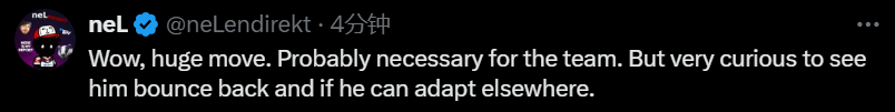 neL:WOW,巨大的变动。可能对队伍来说也是必要的。但很好奇他能否找回状态,并且在其他地方适应。