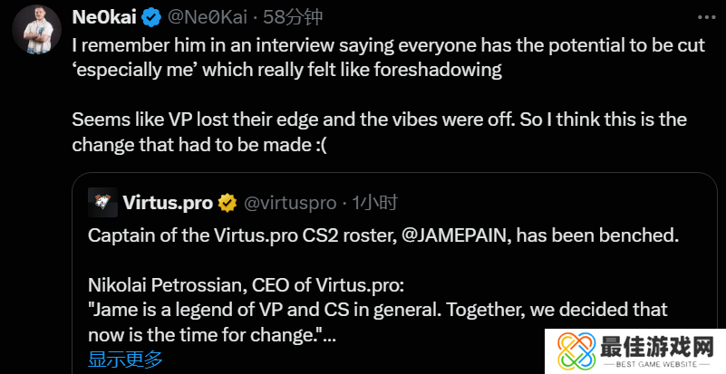 今天Virtus pro战队宣布正式下放Jame。在电子竞技风云变幻的舞台上,VP战队做出下放Jame这一决策,宛如投入平静湖面的巨石,一石激起千层浪,在玩家群体与业内引发轩然大波。以下为VP被下放之