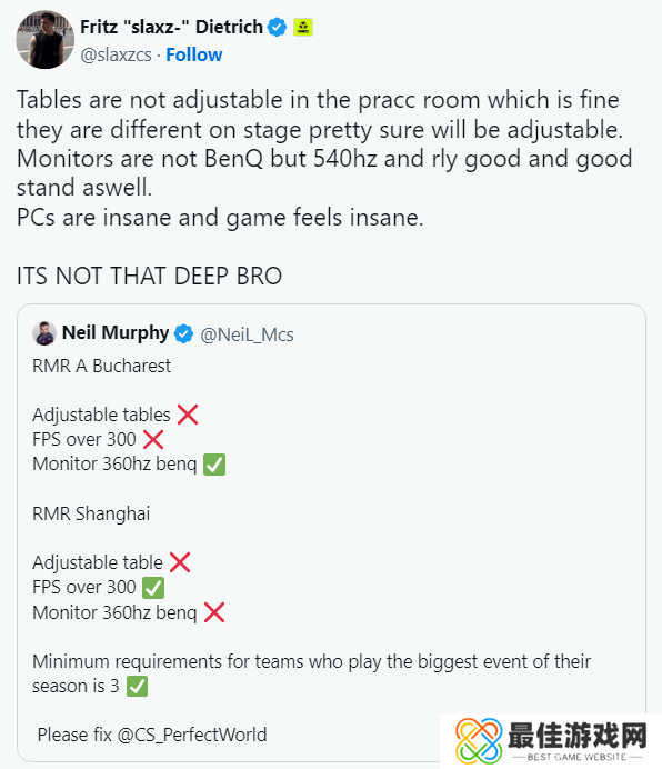A:我看到有人抱怨桌子高度,没看到全部内容,但我看到了slaxz-的动态,我有点同意他的想法。我认为设备没什么问题,电脑运行得很好。显示器和以前用的不一样,但队员们平常使用的显示器都不一样。我们之前参加过