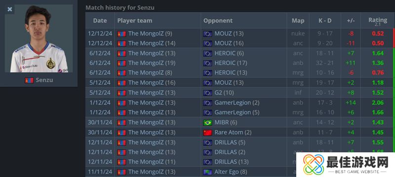 在本场较量中,此前在上海Major赛事中保持不败的The MongolZ在两张图上半场都取得领先的情况下,下半场换边之后却迷失了方向,特别是之前有上佳表现的Senzu更是表现低迷,他在两张地图分别只拿到了0.50和0.52的Rating,这和他在开幕赛阶段和正赛阶段的表现完全是天差地别。此役他打出了本次上海Major最差表现,他的低迷状态也让蒙古战队没能更进一步。