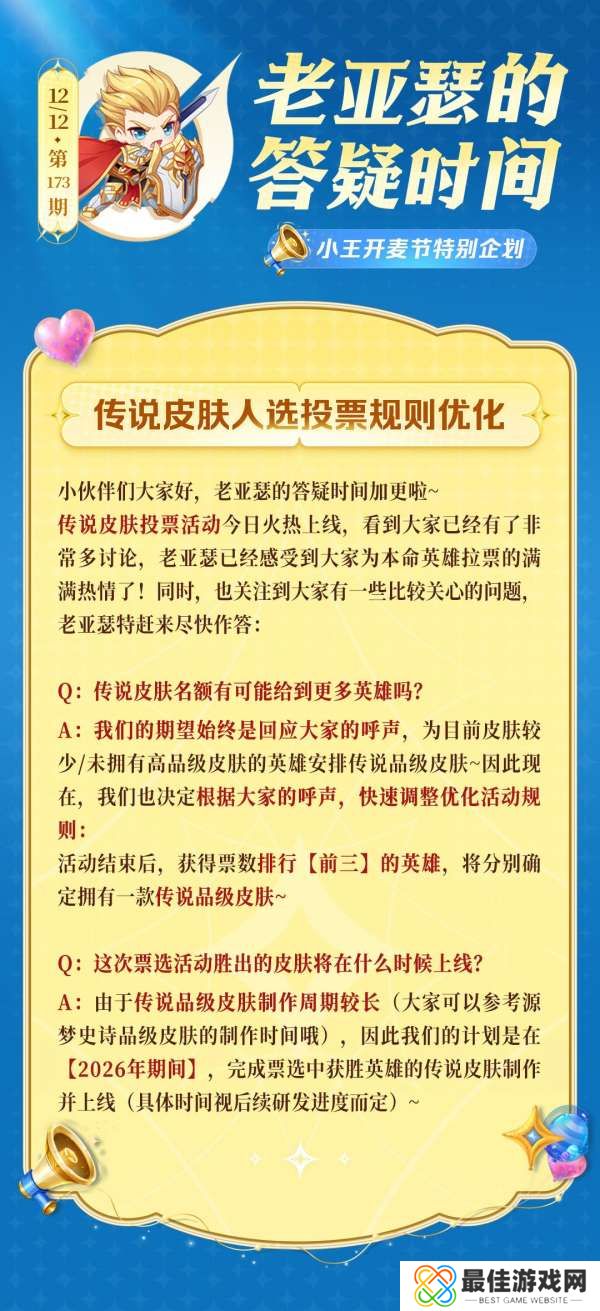 小伙伴们大家好,老亚瑟的答疑时间加更啦~传说皮肤投票活动今日火热上线,看到大家已经有了非常多讨论,老亚瑟已经感受到大家为本命英雄拉票的满满热情了!因此我们决定响应大家的呼声,快速调整优化活动规则:活动