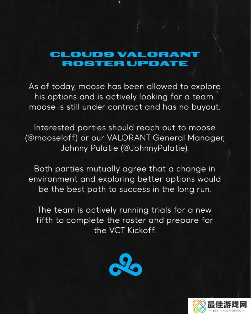 VCT AMER赛区C9战队发布人员变动公告:moose离队成为自由人原文部分大意如下:今天moose已经被允许探索其他选项,他正在积极寻找队伍。moose与我们仍有合同,但无需买断。队伍正积极实训以