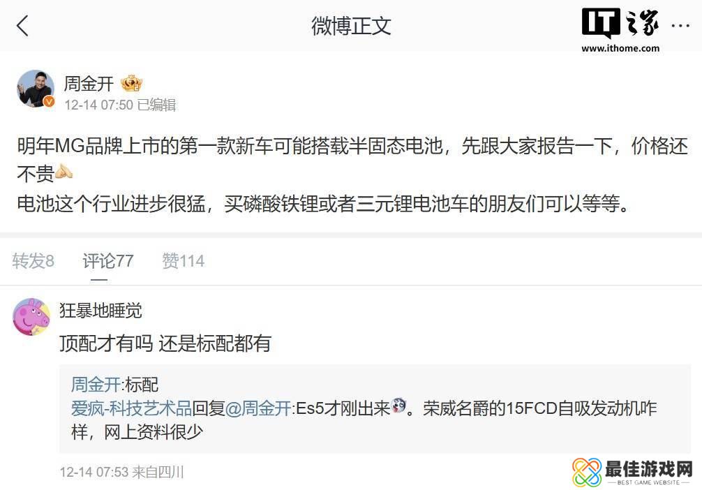 上汽集团名爵品牌事业部总经理周钘近日透露,MG品牌计划在明年推出的首款新车将搭载半固态电池技术,并且价格亲民。这一消息引发了广泛关注。