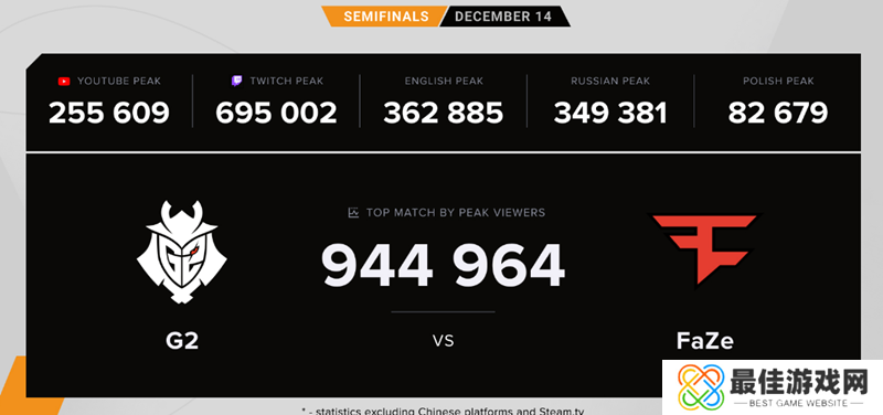 这场比赛的峰值观众人数为944964,接近100万。而之前的开幕赛阶段和正赛阶段比赛的观众人数稳定在30-50万左右。FaZe和G2两支队伍的号召力可见一斑。