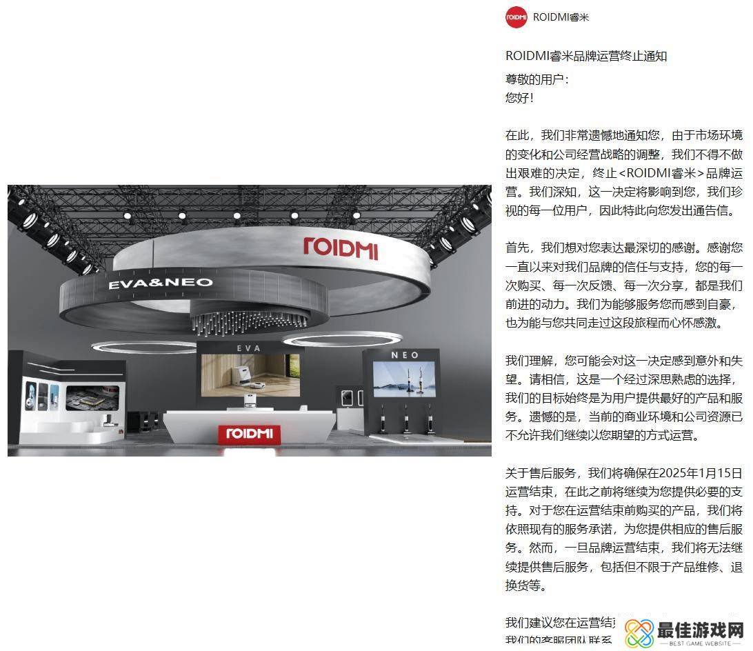 ROIDMI睿米品牌宣布终止运营,售后服务至2025年1月15日
