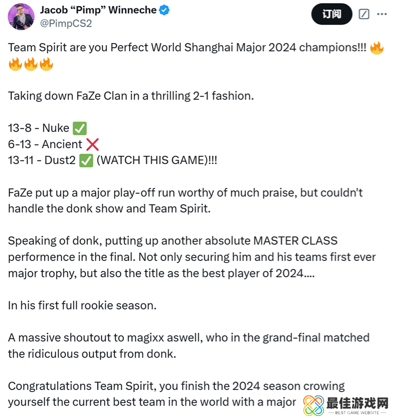 恭喜Spirit,你们在2024赛季结束时以一座Major奖杯为自己加冕,成为目前世界上最好的队伍!