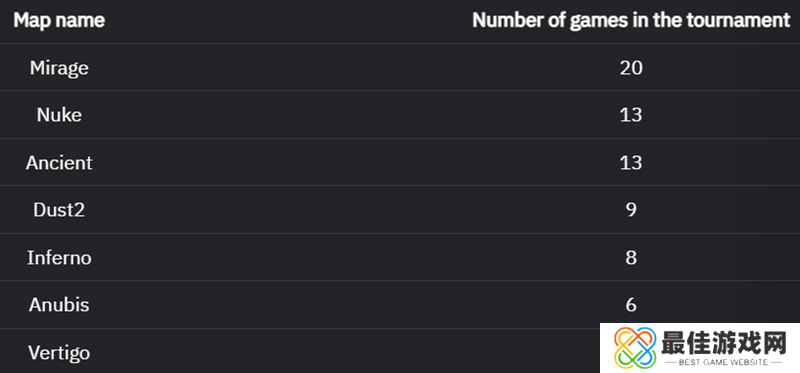 而在整个上海Major期间(正赛阶段和淘汰赛阶段),最受欢迎的是Mirage,一共出场二十次;Nuke和Ancient都是十三次。