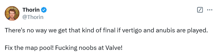 “我们不会在Vertigo或Anubis上见证如此精彩的决赛。请修复地图池,你们这些来自Valve的**!”