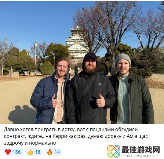 新科CS冠军指挥、Team Spirit选手chopper在个人电报频道分享了一张与Dota2选手CCNC以及Cr1t在日本的合影并配文称 "其实我想打刀塔已经很久了,于是我和身边的这两位聊了聊合同,等