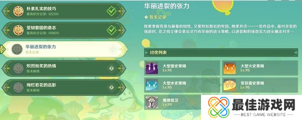 2、大型雷史莱姆、大型火史莱姆、大型水史莱姆、变异雷史莱姆、魔像禁卫、丘丘水行游侠