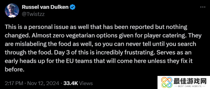 Liquid指挥Twistzz在社媒发文抱怨选手餐饮中素食选项极少。