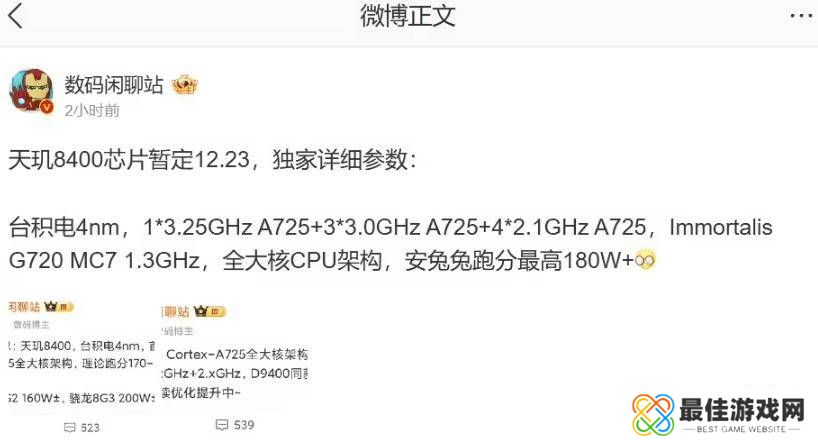 从配置上看,天玑8400似乎延续了天玑9400的旗舰级全大核架构设计。由Cortex-A725组成的全大核架构,有望在性能和能效方面带来显著提升,为用户带来更加流畅的使用体验。