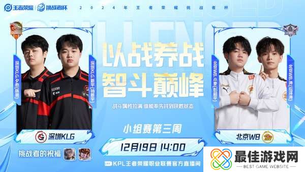 挑杯小组赛分组积分:热点赛事预告:2024年12月19日14:00 深圳KLG vs 北京WB以下为深圳KLG vs 北京WB的比赛前瞻:深圳KLG在上一场对阵武汉eStarPro的比赛里1-2落败,