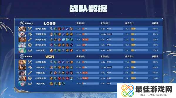 点击链接,为双方选手第一局表现打分>>Game 1:【Ban Pick】蓝色方:深圳KLG挑战者的祝福:鲁班大师 女娲蓝色方禁用:不知火舞 公孙离 马超 亚连 大乔选用:舒尹曹操 云顶梦奇 挽梦沈梦溪