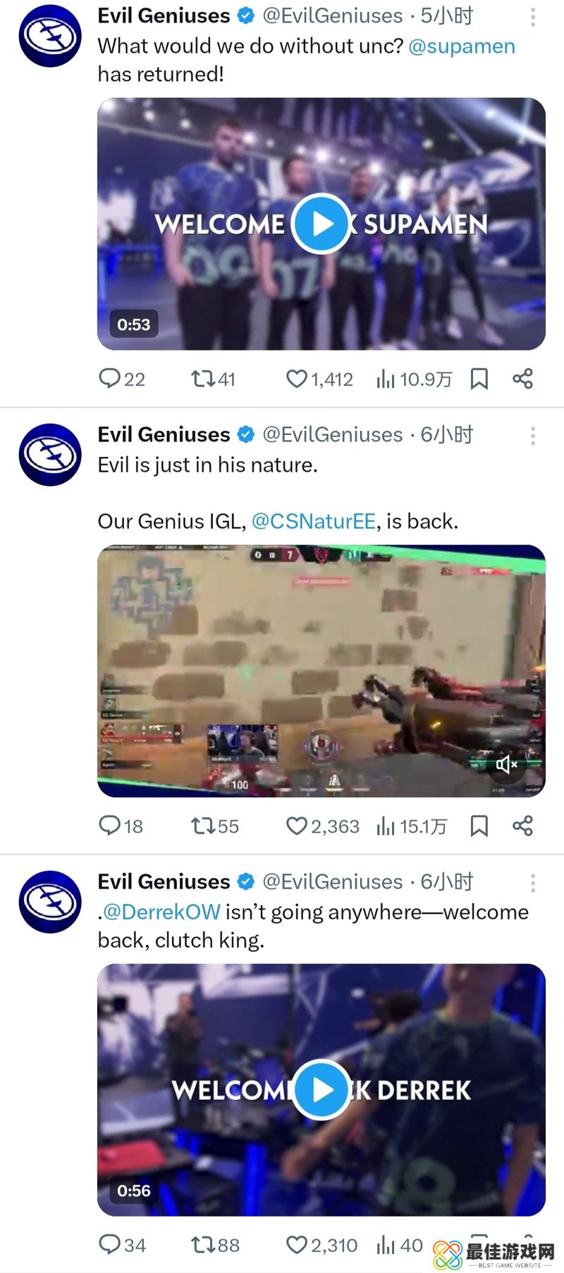 日前,EG俱乐部在推特发布三条选手视频,正式宣布supamen、Derrek、NaturE三人留队,让我们等待EG俱乐部2025年的最终大名单吧。