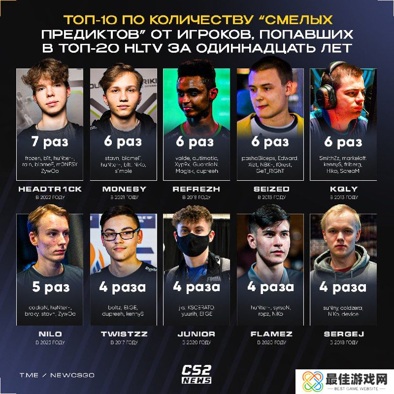 HLTV自公布TOP20选手以来,会让每位TOP20选手选出一名明日之星。到目前为止单年被推荐最多次的仍然是headtr1ck,在2022年共有7名TOP20选手认为他是明日之星,紧随其后的m0NESY、refrezh、seized和kqly分别在当年获得6次推荐。