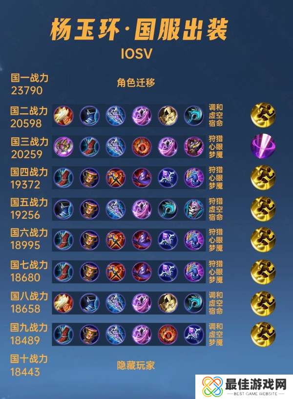 这篇文章我们来看一下40位国服杨玉环的出装铭文汇总。先做一个小统计,40位国服杨玉环,4位角色隐藏或角色迁移,2位走打野位,13位走中路,21位走辅助位。中路标准出装铭文冷静之靴,圣杯,巫师法杖,博学