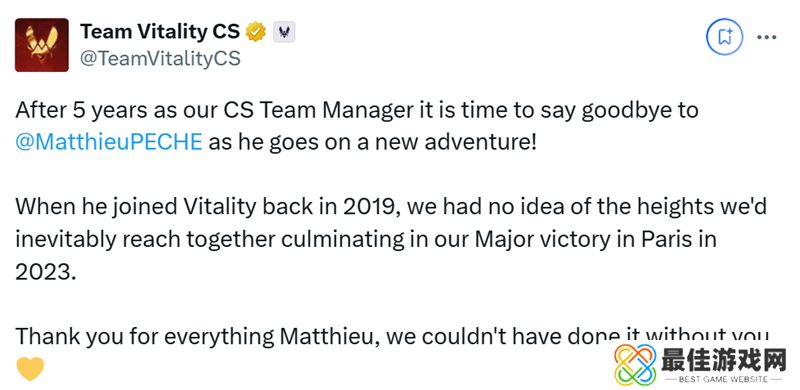 日前Vitality俱乐部在社交平台上宣布同战队CS经理MatthieuPECHE分手。